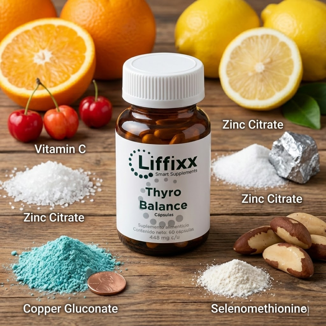 ThyroBalance® aporta una combinación estratégica de vitamina C, citrato de zinc, gluconato de cobre y selenio metionina, micronutrientes clave involucrados en procesos antioxidantes, inmunológicos y metabólicos.